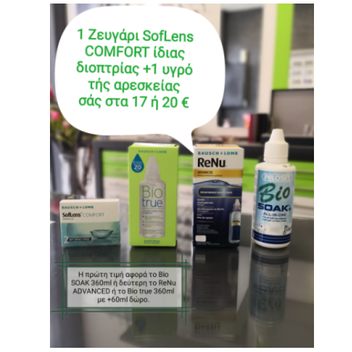 Ένα ζευγάρι ίδιας διοπτρίας SofLens COMFORT + ένα υγρό της αρεσκείας σας στα 17€ ή 20€. Η πρώτη τιμή αφορά το υγρό Bio SOAK 360ml και η δεύτερη το ReNu ADVANCED η το Bio true 360ml +60ml ΔΩΡΟ