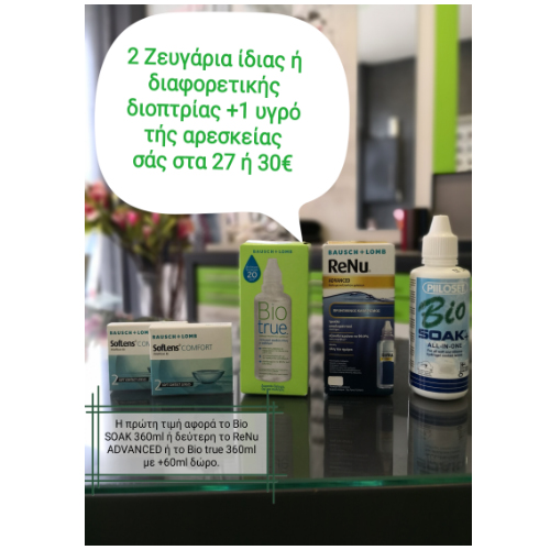 Δύο ζευγάρια ίδιας ή διαφορετικής διοπτρίας SofLens COMFORT + ένα υγρό της αρεσκείας σας στα 27€ ή 30€. Η πρώτη τιμή αφορά το υγρό Bio SOAK 360ml και η δεύτερη το ReNu ADVANCED η το Bio true 360ml +60ml ΔΩΡΟ
