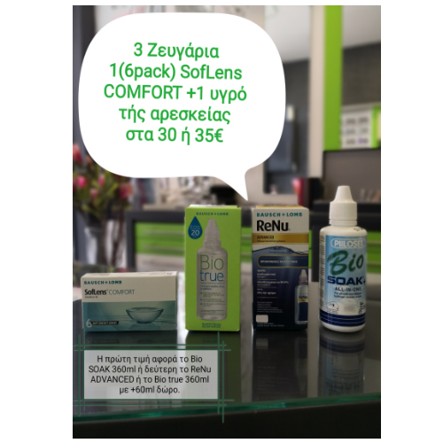Τρία ζευγάρια 1(6pack) SofLens COMFORT + ένα υγρό της αρεσκείας σας στα 30€ ή 35€. Η πρώτη τιμή αφορά το υγρό Bio SOAK 360ml και η δεύτερη το ReNu ADVANCED η το Bio true 360ml +60ml ΔΩΡΟ