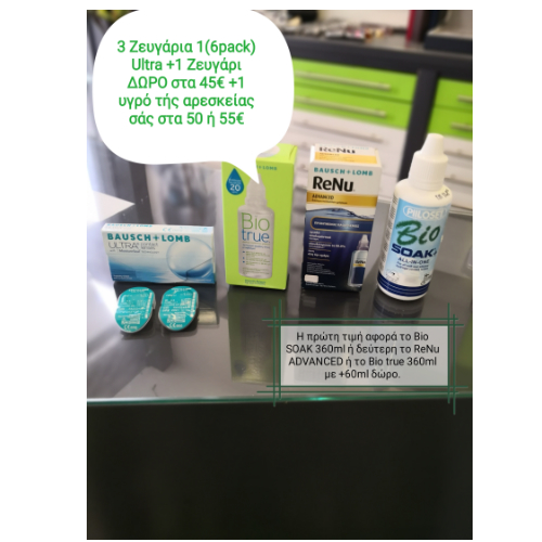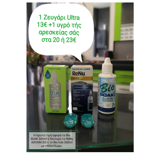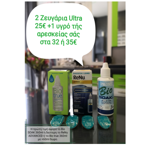 Δυο ζευγάρια Ultra 25€ + ένα υγρό της αρεσκείας σας στα 32€ η 35€. Η πρώτη τιμή αφορά το υγρό Bio SOAK 360ml και η δεύτερη το ReNu ADVANCED η το Bio true 360ml +60ml ΔΩΡΟ